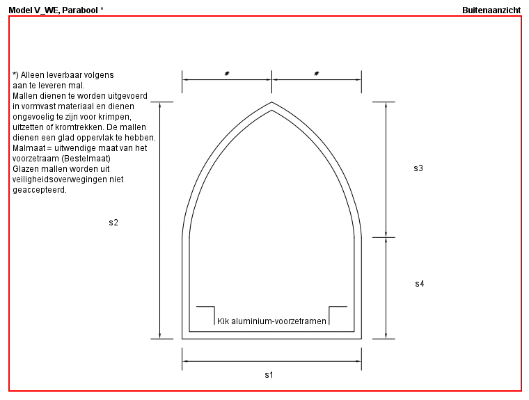*) Alleen leverbaar volgens aan te leveren mal. Mallen dienen te worden uitgevoerd in vormvast materiaal en dienen ongevoelig te zijn voor krimpen, uitzetten of kromtrekken. De mallen dienen een glad oppervlak te hebben. Malmaat = uitwendige maat van het voorzetraam (Bestelmaat) Glazen mallen worden uit veiligheidsoverwegingen niet geaccepteerd.